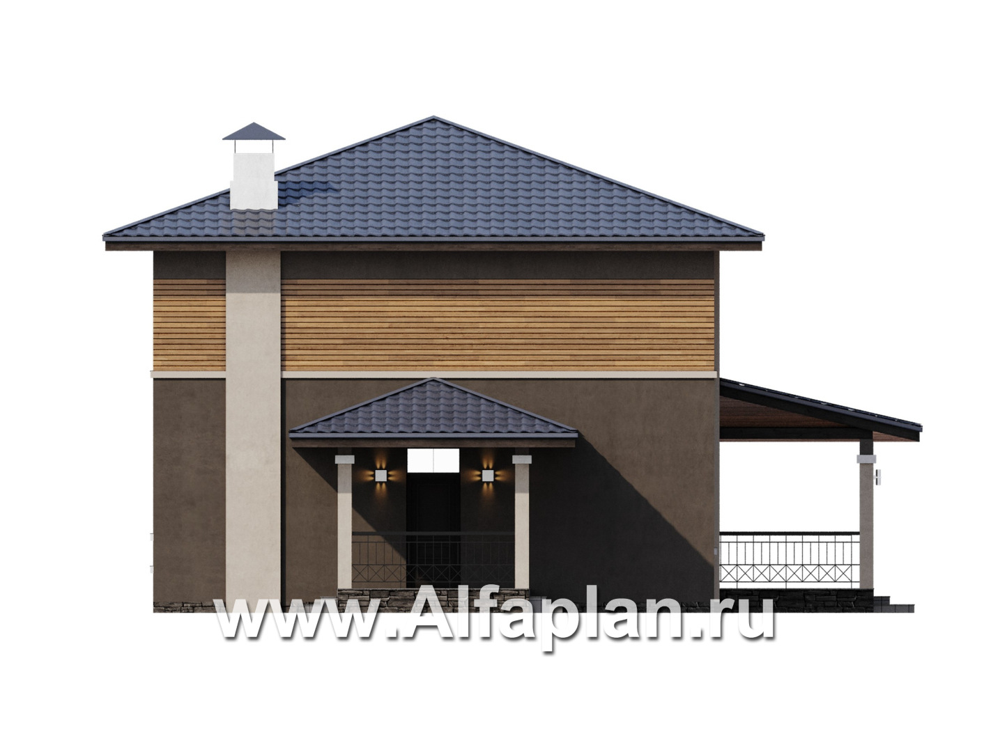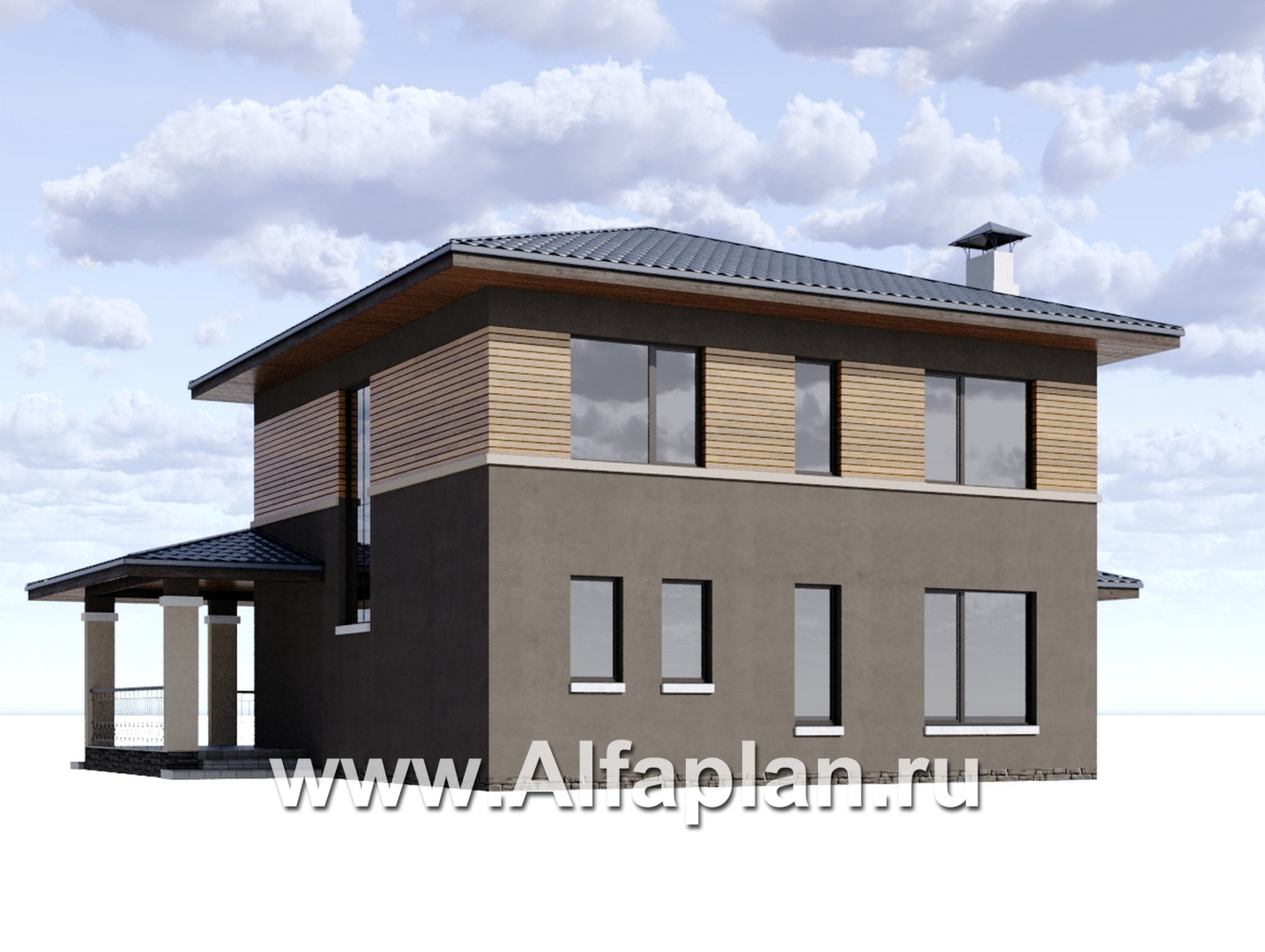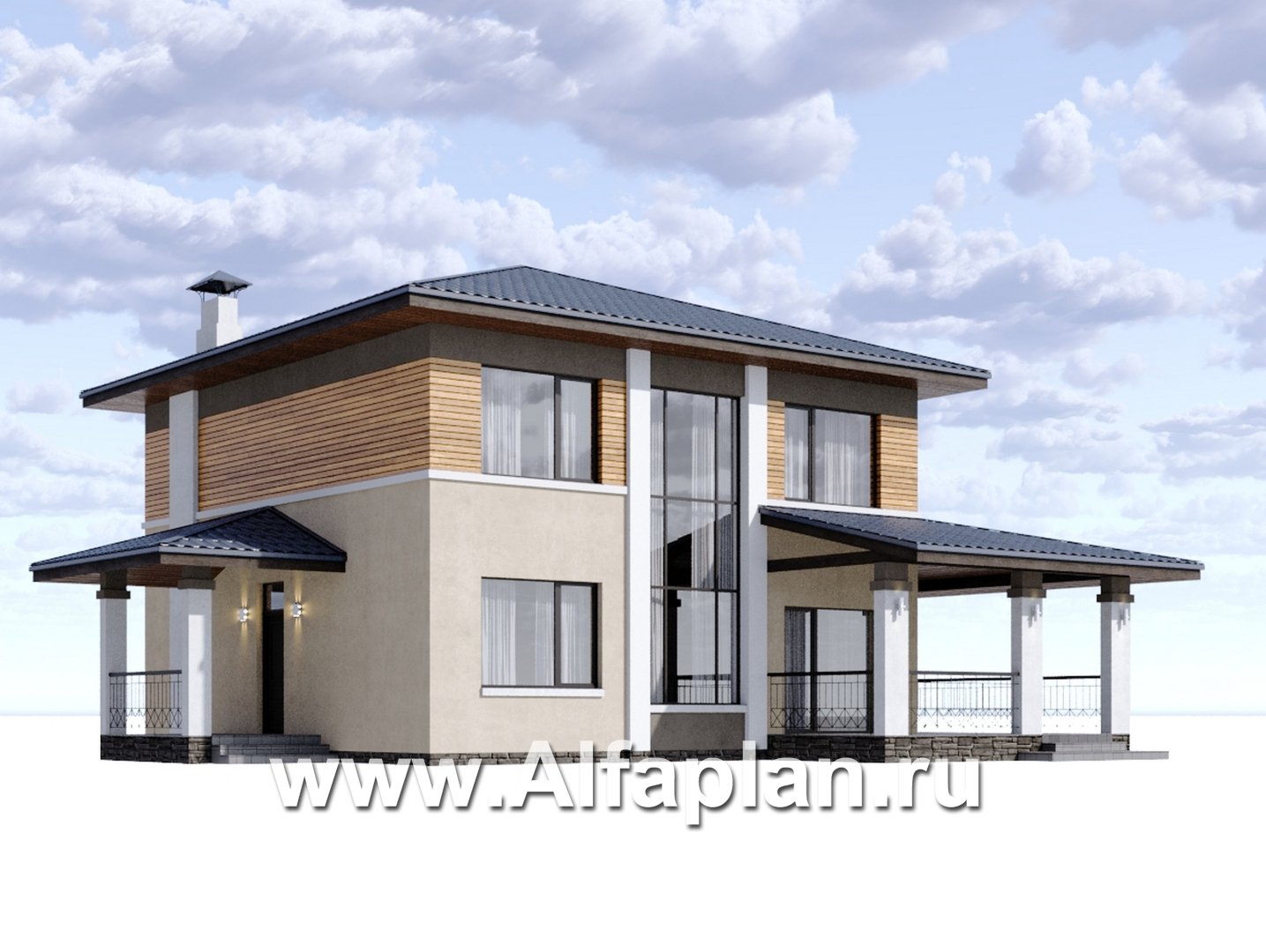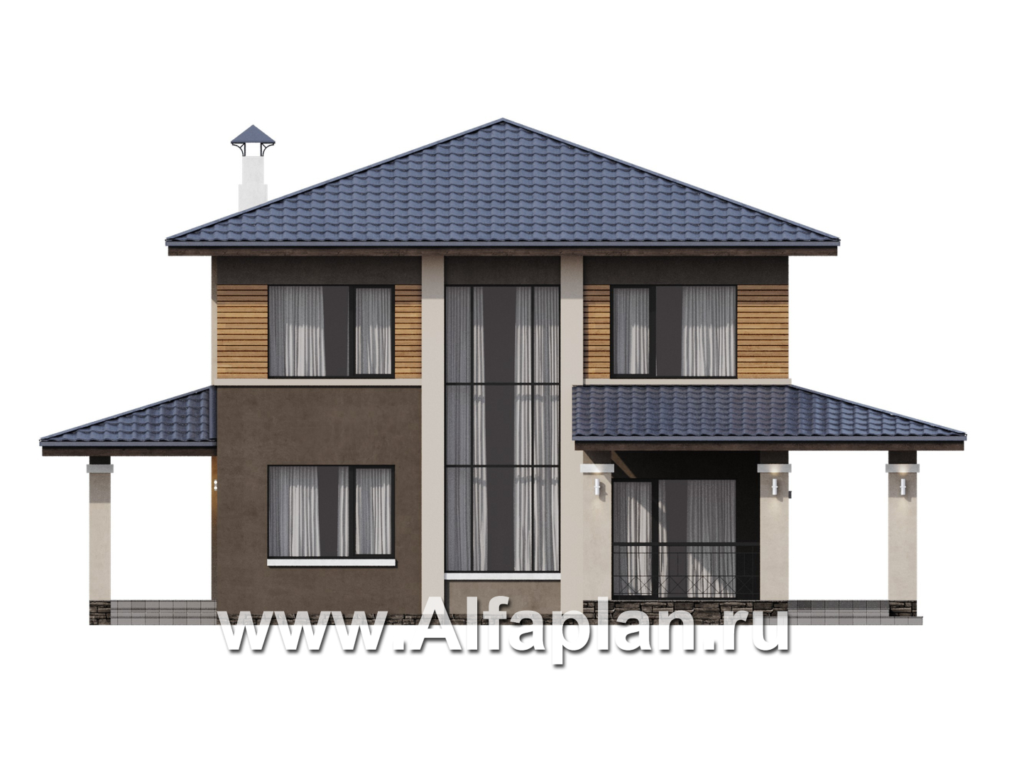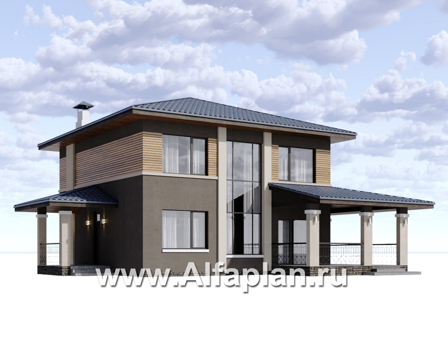 «Юта» - проект двухэтажного дома из кирпича, со вторым светом в столвой, с террасой, в стиле Райта