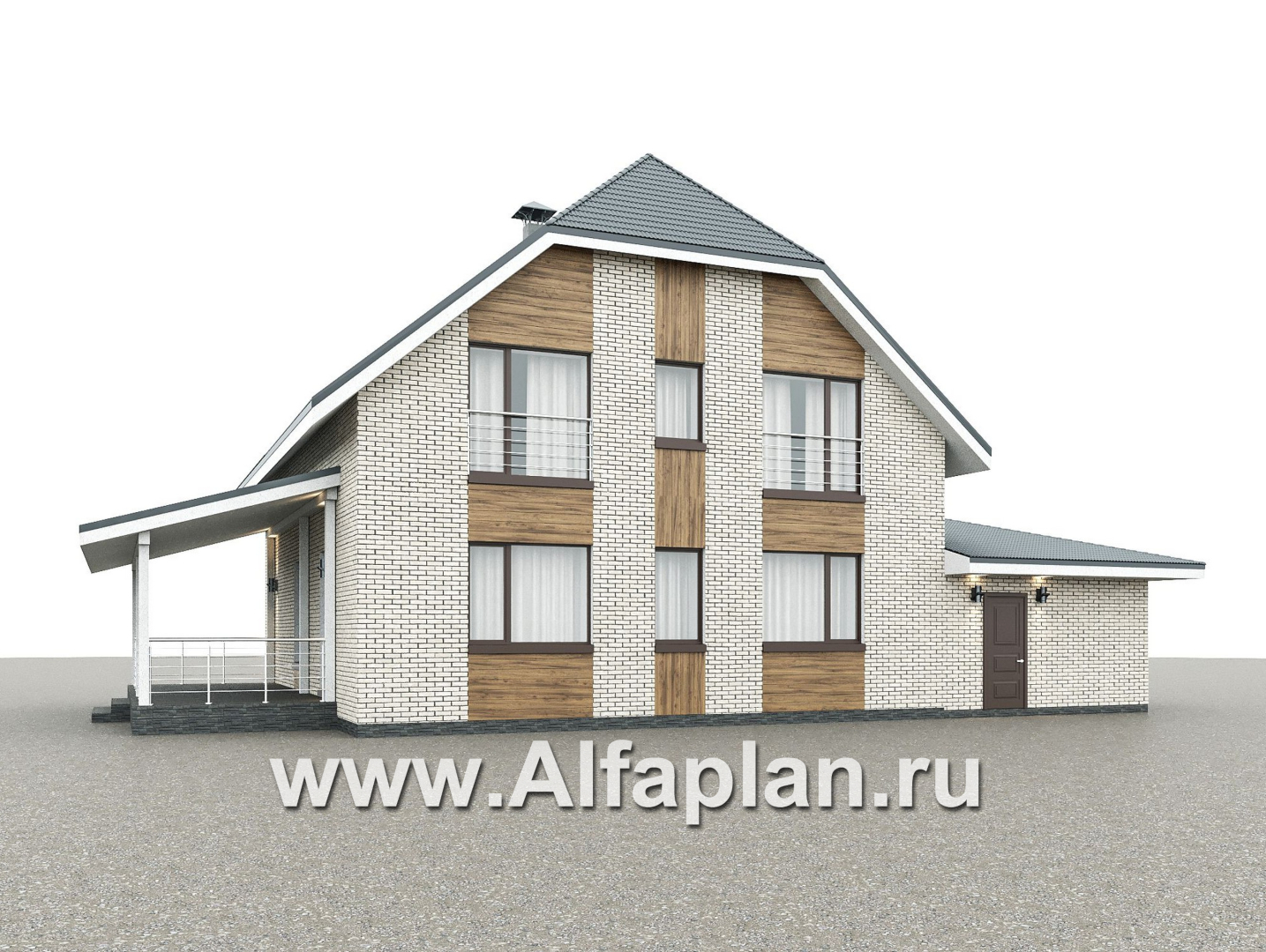 «Династия» - проект дома с мансардой, мастер спальня, с террасой сбоку и гаражом с мастерской