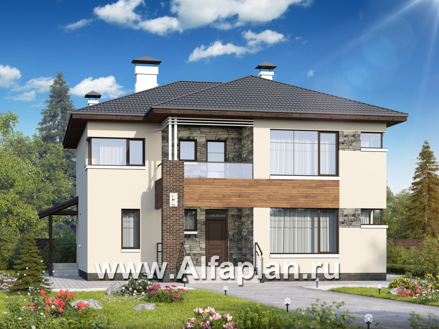 Проект дома 560А-2 «Прайд» - просторный коттедж с отличным набором комнат, и красивым современным внешним видом.  Общая площадь дома 237 м2.