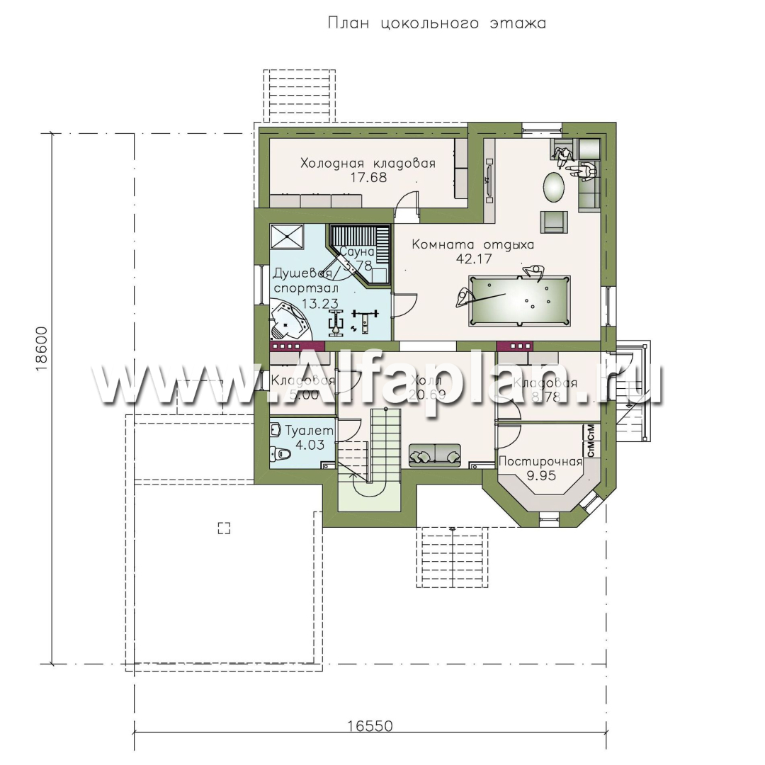 • Размещение в цокольном этаже сауны со спортзалом-душевой.