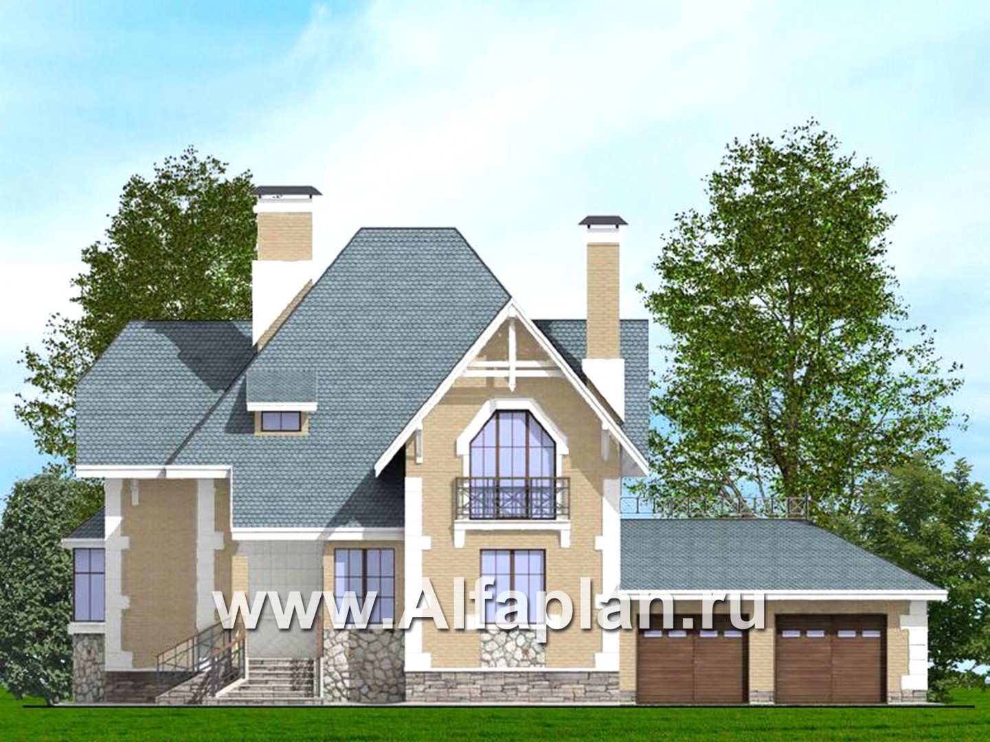 Центральный вход в дом украшают  колонна и две лестницы. Перила балкона и лестниц  выполнены в одном варианте. Цоколь особняка высокий, отделан  облицовочным камнем. Двухэтажная жилая часть и пристроенный гараж формируют объем дома. Особняк имеет три входа: центральный, с главного фасада, второй  идет  через веранду, а третий  - непосредственно  через гараж.