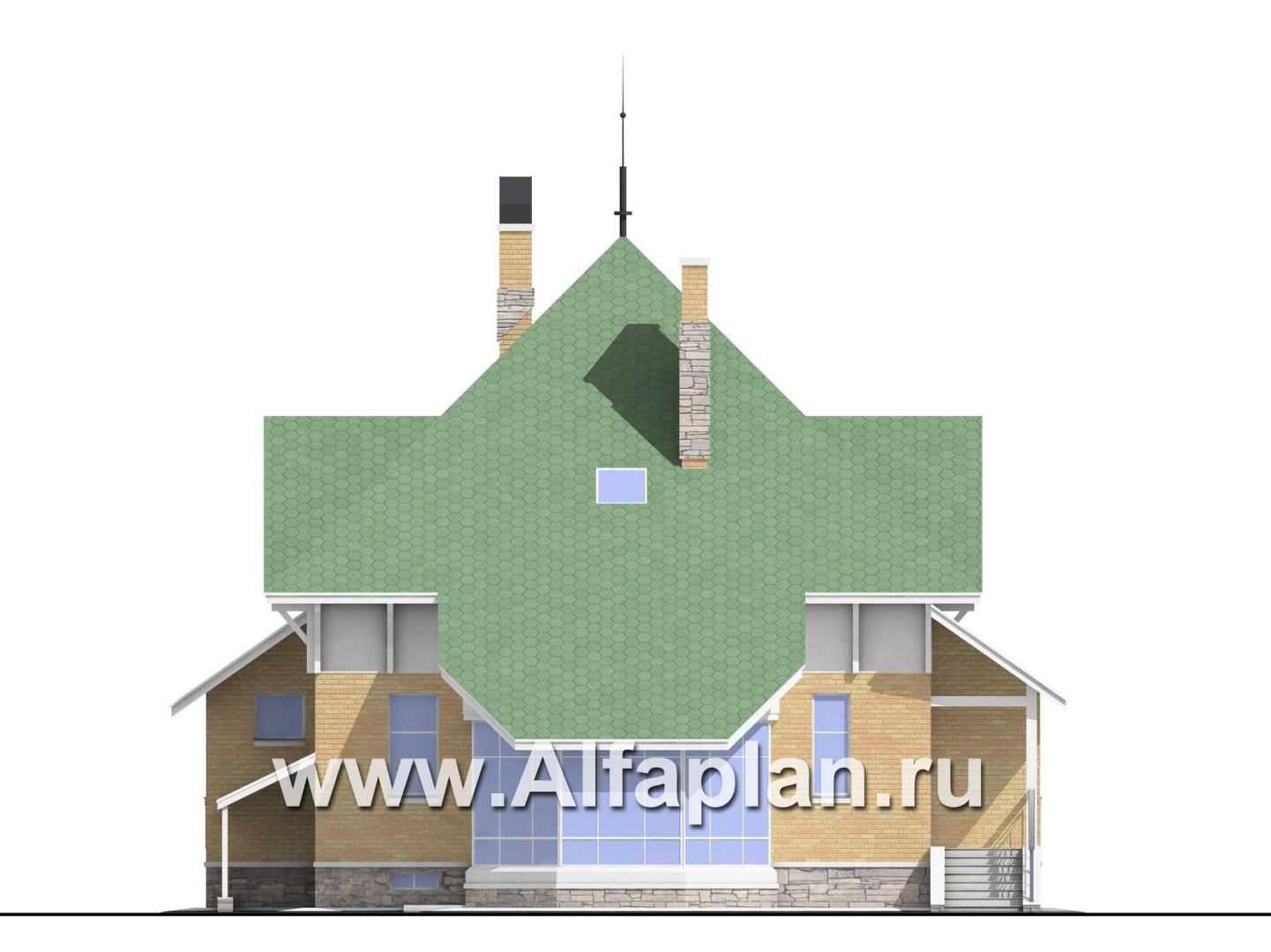 Дизайн экстерьера выполнен в светлых тонах. Пастельно- зеленая крыша прекрасно гармонирует со светло-желтым облицовочным кирпичом. Довершают этот образ белая декоративная штукатурка и светло-серый искусственный камень. Композиция, в итоге, очень легкая, почти воздушная.