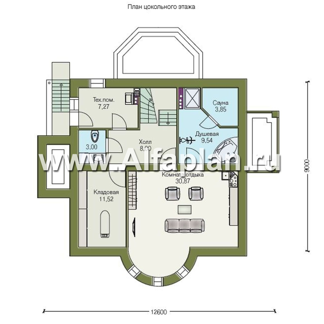 Итак, цокольный этаж. К нему ведет лестница, расположенная с левой стороны здания. Также спуститься сюда можно по лестнице непосредственно из дома. В центре этажа просторный холл. По левую руку от него техпомещение и санузел, по правую большая душевая, совмещенная с сауной. Есть на этаже и вместительная кладовая. Но, конечно, большую часть цоколя занимает уютная комната отдыха с замечательной площадью более 30 метров.