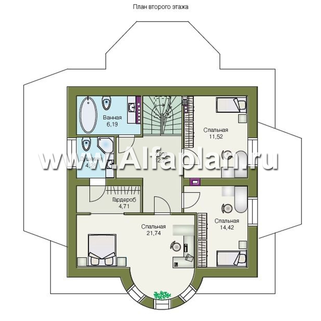 Второй этаж занимают три большие спальные комнаты, одна из которых увеличена еще и эркером. Кроме того, в ней есть собственные гардероб и душевая. Все спальни угловые и прекрасно освещенные. В центре второго уровня холл. Справа устроена просторная ванная комната.