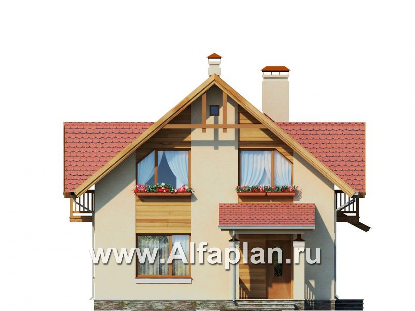 Этот небольшой дом оптимален по всем показателям, включая планировку и конструктивное решение. Компактное пятно застройки позволит посадить его на небольшой участок. Монолитная плита основания снимет ограничения по использованию участков со сложными грунтами. Предложенная конструктивная схема избавит от необходимости тяжелой строительной техники на стройплощадке. В планировке отсутствуют избыточные помещения, но есть все необходимое для жизни одной небольшой семьи. На первом этаже расположены гостиная и смежная с ней кухня, котельная и холл-прихожая. Предваряет вход в дом небольшое крылечко по бокам оформленное колоннами. На мансарде расположены три спальни и ванная комната. У двух спален есть небольшие балкончики.