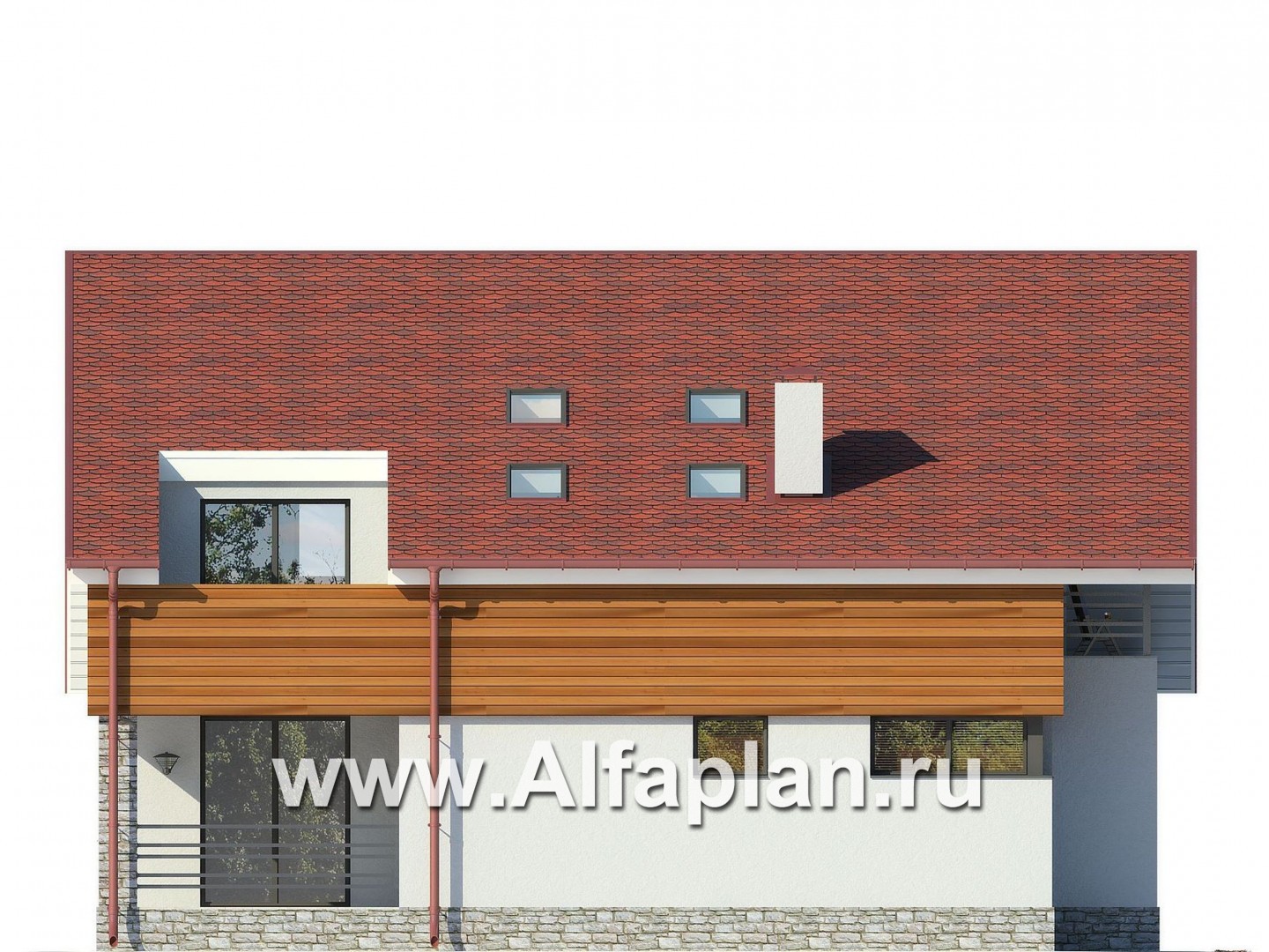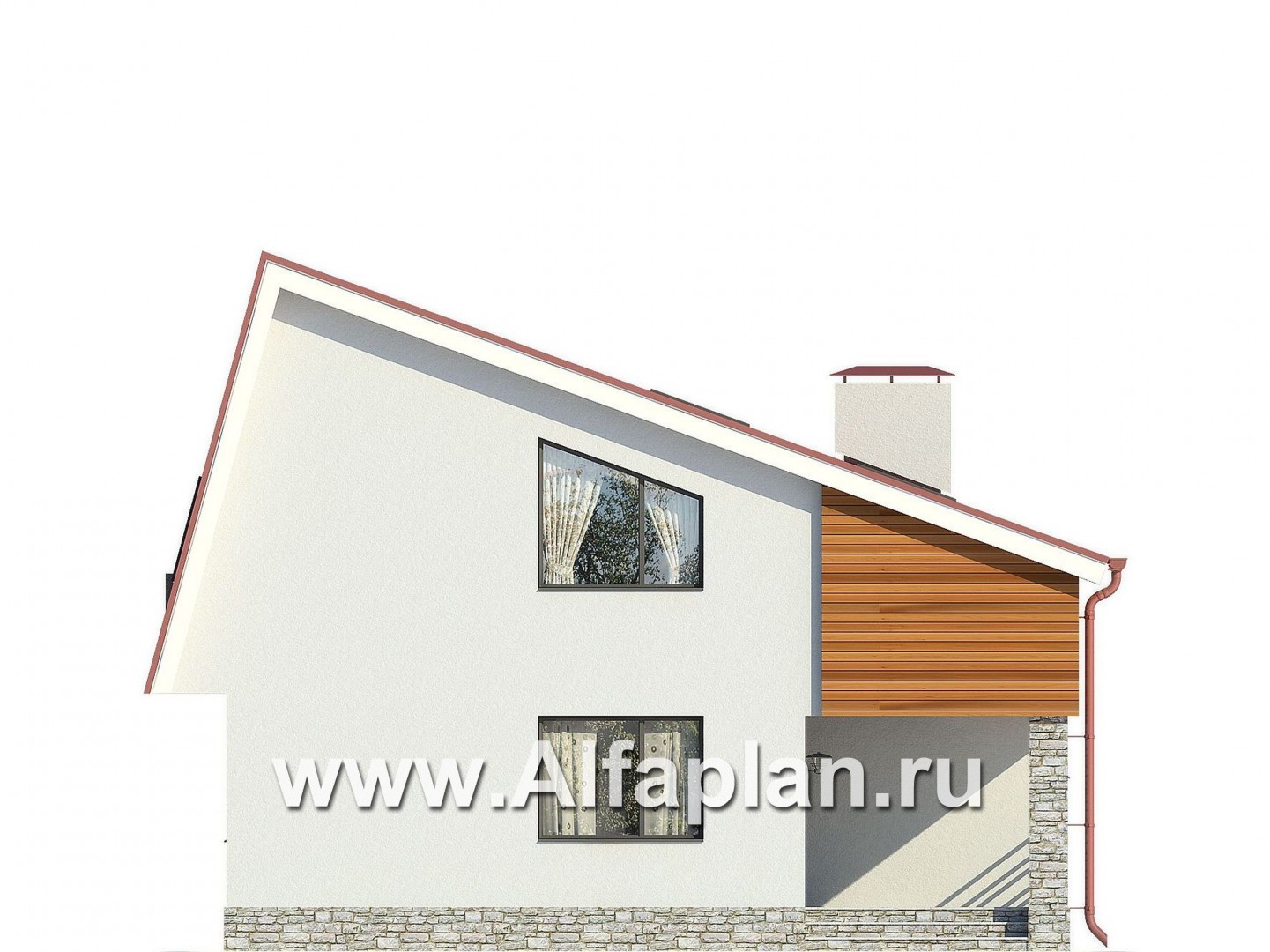 Продолжая тему окон, невозможно обойти вниманием эффектные конструкции на боковых фасадах. Панорамные окна неправильной формы не только подчеркивают геометрию кровли, но и обеспечивают этому газобетонному дому отличное естественное освещение. Ну, а угловые окна придают очертаниям постройки воздушность и элегантность. Интересно цветовое и фактурное решение фасадов: перед нами беспроигрышное сочетание белых оштукатуренных поверхностей, математического ритма вагонки цвета молочного шоколада и неправильностей серо-бежевого рустового камня, которым облицован цоколь. В этот альянс вклинивается бордовый оттенок битумной черепицы, предложенной для оформления кровли.