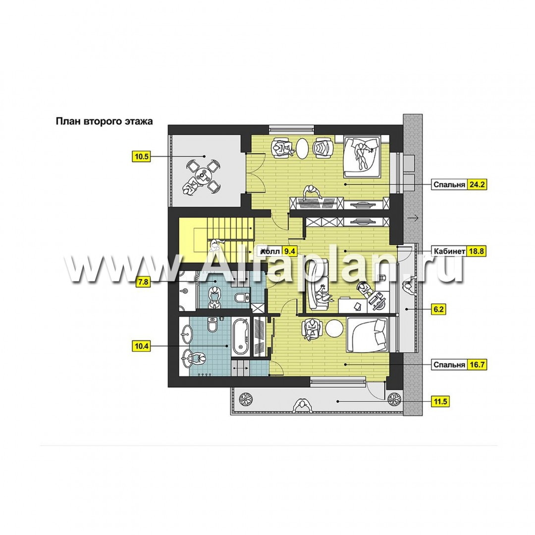 Пространство второго этажа, согласно проекту газобетонного дома, отдано под помещения приватной зоны. Прежде всего, это две спальни: помещение со стороны левого фасада располагает собственным санузлом, а также выходом на узкий балкон. В распоряжении обитателей спальни со стороны правого фасада имеется просторная лоджия.