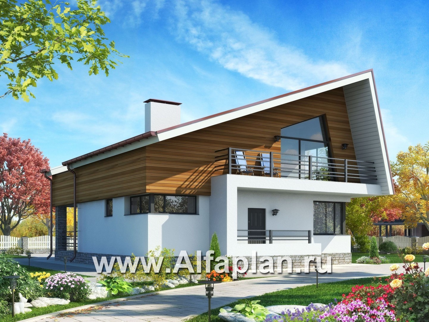 K-103 Проект современного дома с мансардой, планировка с кабинетом на 1 эт, с террасой и с балконом, в стиле хай-тек