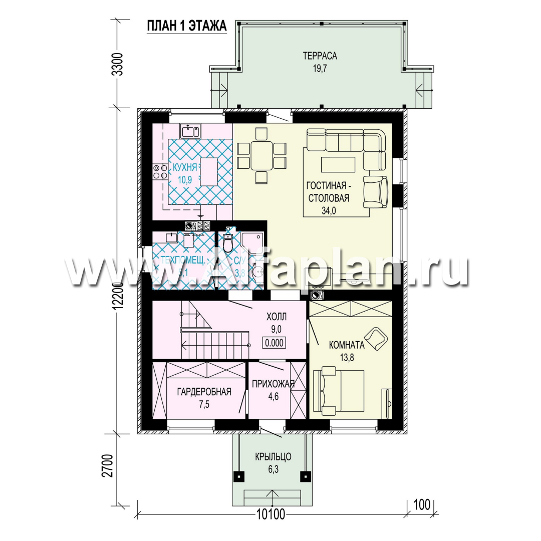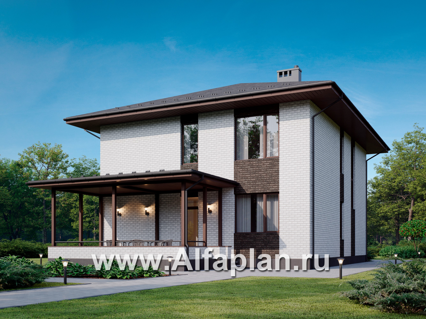 Проект двухэтажного коттеджа, планировка с гостевой на 1 эт, с террасой, в стиле минимализм